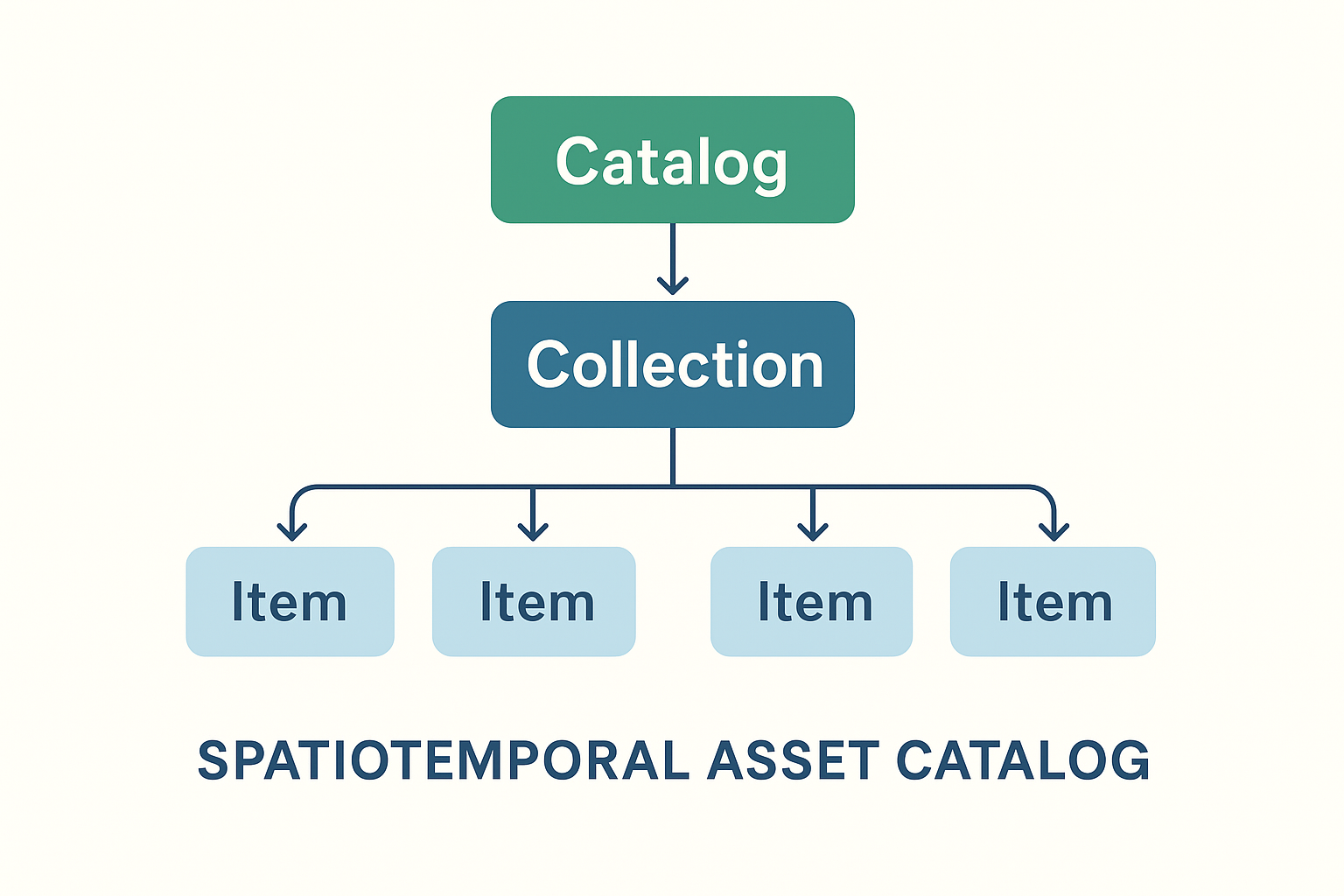 - Catalogs: Collections can be organized hierarchically, enabling scalable discovery across petabytes of EO data.